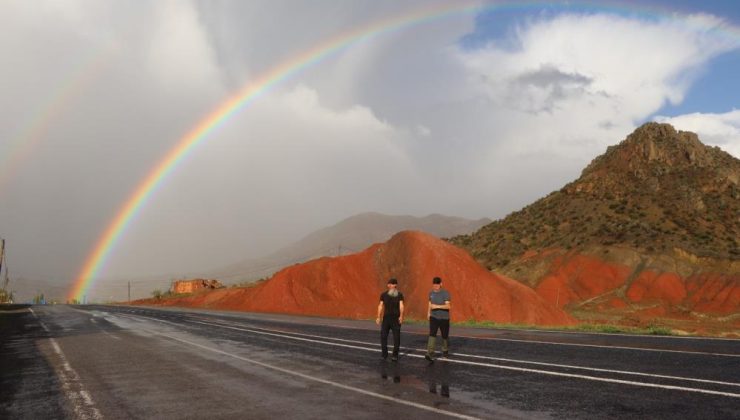 Erzurum’un Oltu ilçesinde etkili olan yağmurun ardından Yolboyu Mahallesi’nde bulunan Kırmızı Tepeler, gökkuşağı ile birlikte adeta görsel bir şölen sundu.