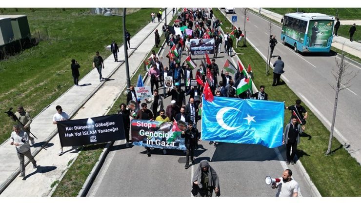 Cuma namazının ardından başlayan yürüyüşte katılımcılar Türk Bayrağı, Filistin Bayrağı ve Doğu Türkistan Bayrağı’nın yanı sıra çeşitli dövizler taşırken “Nehirden Denize Özgür Filistin, Doğu Türkistan Yalnız Değildir ve Susma, Zulme Sessiz Kalma” sloganları eşliğinde Rektörlük binası önüne yürüdü.