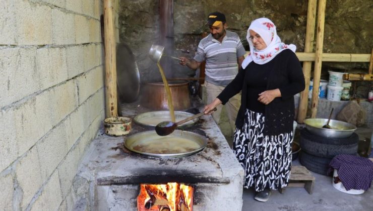 Erzurum’un Olur ilçesine bağlı Ormanağzı Mahallesi’nde coğrafi işaretli ‘Karnavas Dut Pekmezi’ üretimi geleneksel yöntemlerle yapılıyor.