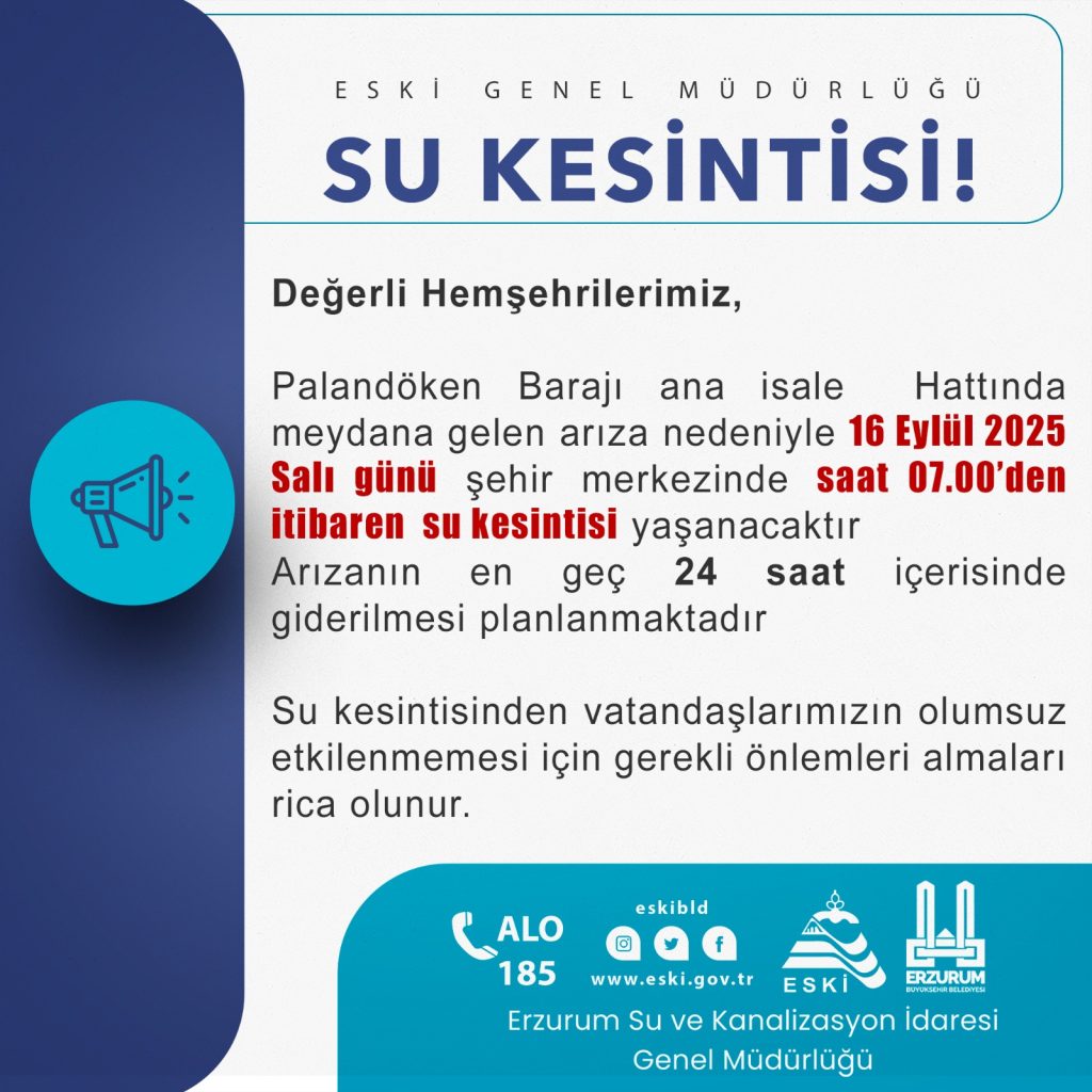 Palandöken Barajı ana isale Hattında meydana gelen arıza nedeniyle 16 Eylül 2025 Salı günü şehir merkezinde saat 07.00’den itibaren su kesintisi yaşanacaktır. Arızanın en geç 24 saat içerisinde giderilmesi planlanmaktadır.