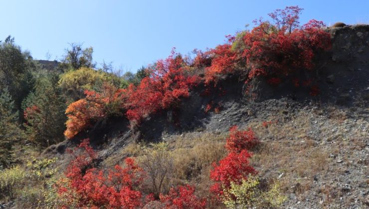 Erzurum’un Oltu ilçesine bağlı Arıtaş Mahallesi’nde sonbaharın gelişiyle birlikte doğa adeta kırmızıya büründü. Meralarda bulunan kaplaç (yabani kiraz) ağaçları, bu yıl sarı yerine kırmızıya dönen yapraklarıyla kartpostallık görüntüler oluşturdu.