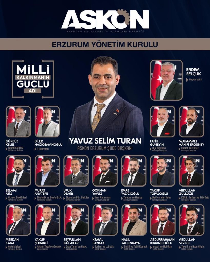 ASKON Şube Başkanı Yavuz Selim Turan’ın kentin ekonomik anlamda daha da büyüyeceğine inandığını dile getirdi. Başkan Turan, Anadolu Aslanları İş Adamları Derneği Erzurum Şubesi’nin Yönetim Kurulunun hayırlı olmasını diledi.