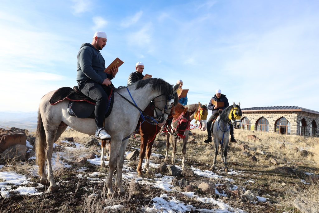 Camilerde sabah namazı ile birlikte hatim indirilmeye başlanan Erzurum’da, bugün Pir Ali Baba Türbesi’nde de bir program düzenlendi. 19 Aralık 2025-15 Ocak 2026 tarihleri arasında devam edecek olan 1001 Hatim geleneği, her yıl Dutçu köyü yakınlarındaki tepede bulunan Pir Ali Baba Türbesi’nde başlatıldı. Pir Ali Baba Türbesi’nde düzenlenen törende tekbirler eşliğinde atlar üzerindeki hafızlar, Pir Ali Baba’nın yaşadığı dönemde Kur’an-ı Kerim okuyarak şehri dolaşmasını temsili olarak canlandırdı. Hafızlar hilal şeklinde oluşturdukları düzenle ellerindeki cüzler ile ‘1001 Hatim’i bu yıl başlatmış oldu.