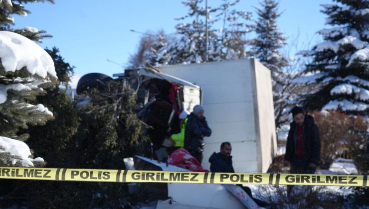 Erzurum’da meydana gelen kazada bir kamyon hızını alamayarak refüje çıkıp devrildi. Kamyonun hızını, çarparak kökünden söktüğü ağaç kesti.